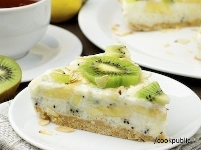 - Кивитата изчистете и нарежете на кубчета. Добавете лимоновия сок и захарта.
